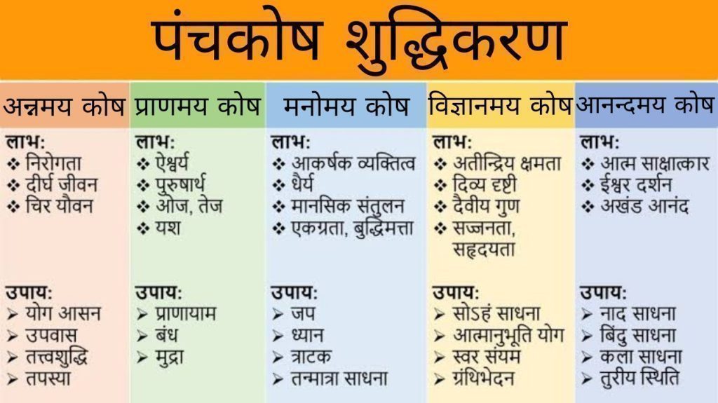 इनमें से अन्नमय कोष स्थूल शरीर कहलाता है, प्राणमय, मनोमय व विज्ञानमय कोष सूक्ष्म शरीर कहलाता है तथा आनन्दमय कोष कारण शरीर कहलाता है।