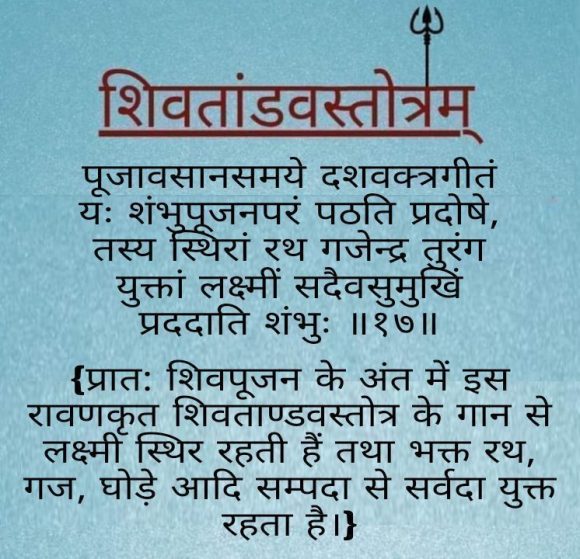 परन्तु शिव के अनन्य भक्त रावण का हाथ कैलाश पर्वत के नीचे दब गया और वह आर्त्तनाद कर उठा- “शंकर शंकर” – अर्थात क्षमा करिए, क्षमा करिए, और भगवान शिव को प्रसन्न करने के लिए स्तुति करने लग गया; जो कालांतर में शिव तांडव स्तोत्र कहलाया। शिव ताण्डव स्तोत्र से शिव जी इतना खुश हुए की आशुतोष भगवान भोलेनाथ ने ना केवल रावण को सकल समृद्धि और सिद्धि से युक्त सोने की लंका ही वरदान के रूप में दी अपितु सम्पूर्ण ज्ञान, विज्ञान तथा अमर होने का वरदान भी दिया। शास्त्रों मे कहा जाता है की शिव ताण्डव स्तोत्र सुनने मात्र से ही व्यक्ति सम्पत्ति, समृद्धि अथवा सन्तादि प्राप्त करता है।